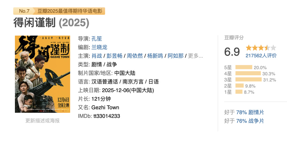 《得闲谨制》不是一部常规意义上的战争片,但孔笙的镜头质感、兰晓龙的剧本功底,再加上演员们的稳定发挥,让这部作品兼具温度与深度,6.9的豆瓣打分,确实低了。