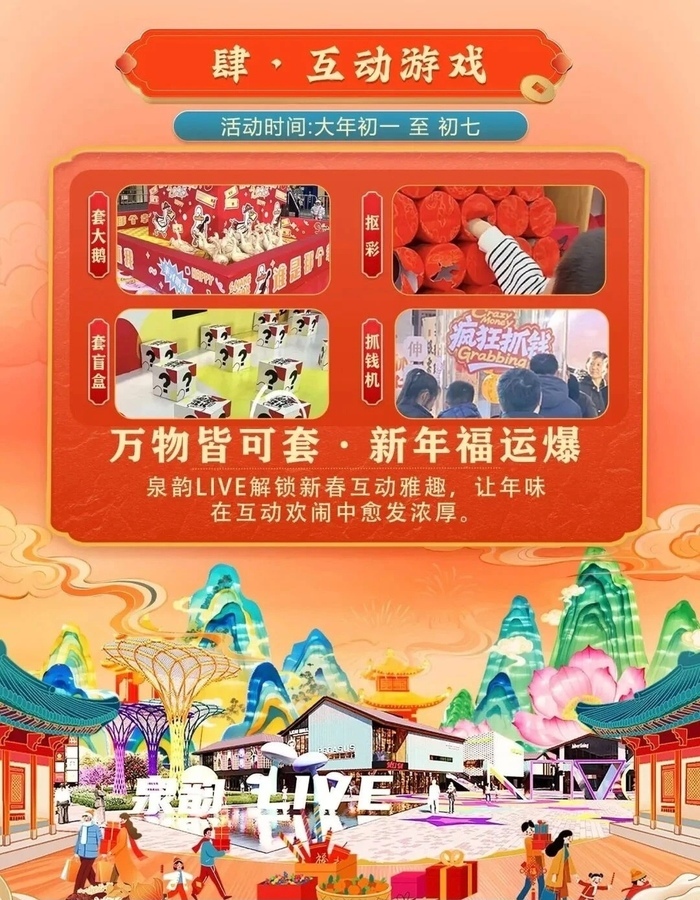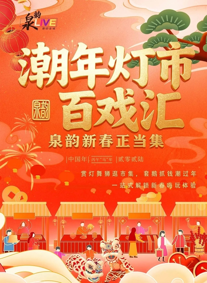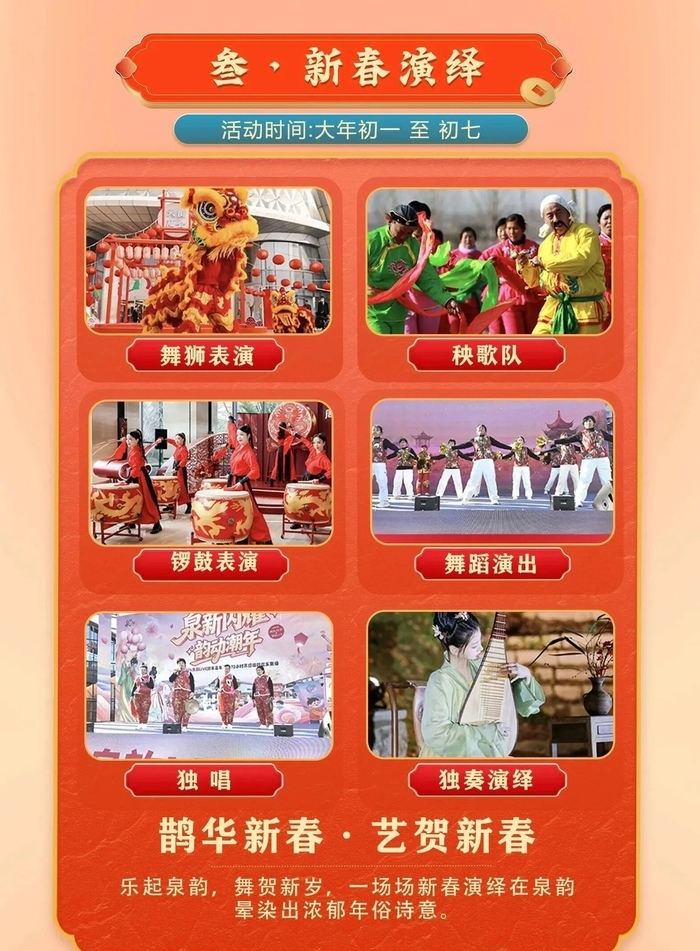 年味何处寻?泉韵正当时。2026年新春佳节,济南起步区鹊山生态文化区内的泉韵LIVE重磅推出“潮年灯市百戏汇—泉韵新春正当‘集’”主题活动,旨在打造一个融合传统精髓与潮流表达的体验式文化目的地,邀请广大市民共赴一场地道又新潮的中国年。活动详情如下: