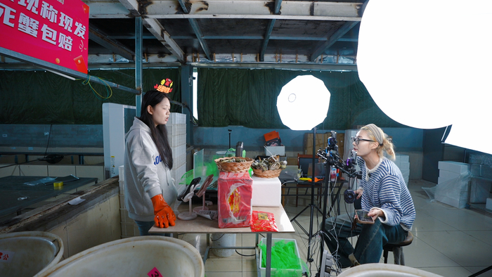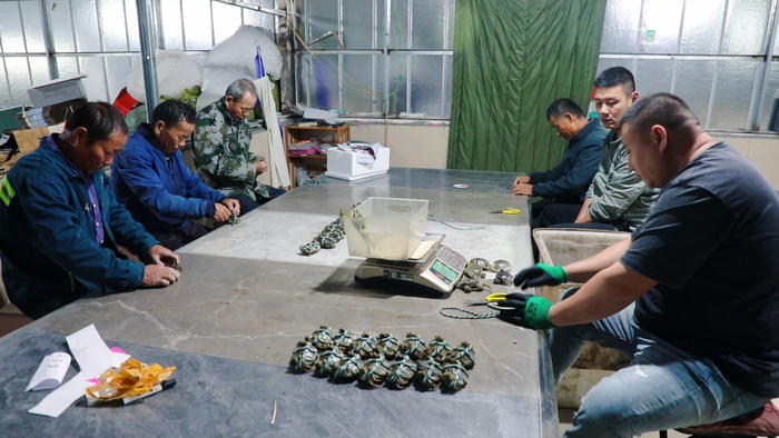 线上销售也彻底改变了生态园的销售渠道格局。在电商之前,这里的螃蟹全部走线下批发,外销为主。如今,线上销售已占到七成。由于螃蟹质量高,他们甚至为江苏的一些直播间做代发,“卖的是苏州蟹的品牌,但实际是从我们基地发货的精品蟹。”每天清晨五六点,挂着“苏U”“苏E”“苏C”等牌照的货车就会在生态园外排队等候,将规格在2.8两到3.2两之间的“普蟹”以批发价运走,这些蟹到了江苏,经过包装成为“四九精品蟹”。