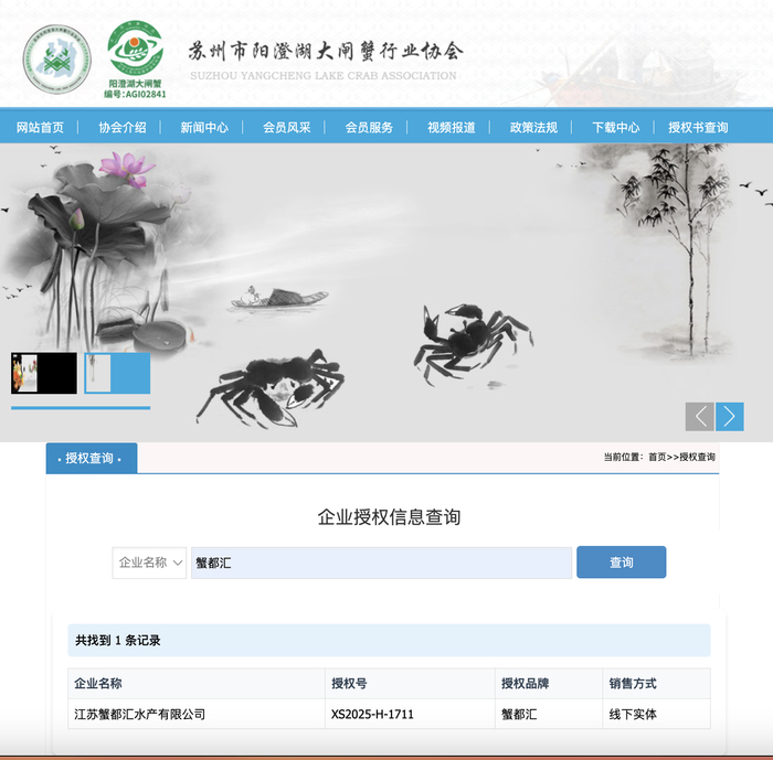 不过,记者在苏州市阳澄湖大闸蟹行业协会官网查询发现,蟹都汇品牌所在公司江苏蟹都汇水产有限公司系苏州市阳澄湖大闸蟹行业协会会员单位,亦能查到“2025年阳澄湖大闸蟹原产地授权企业”具体明细。这究竟是怎么一回事?