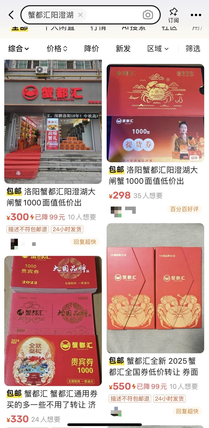 “蟹都汇阳澄湖大闸蟹,1000元面值低价出。”“2025蟹都汇全国券低价转让”。近日,根据网友提供的线索,记者在闲鱼平台发现,多个卖家正在出售各类面值蟹都汇提货券。有不少卖家在出售提货券时,标注了“阳澄湖大闸蟹”宣传字样。