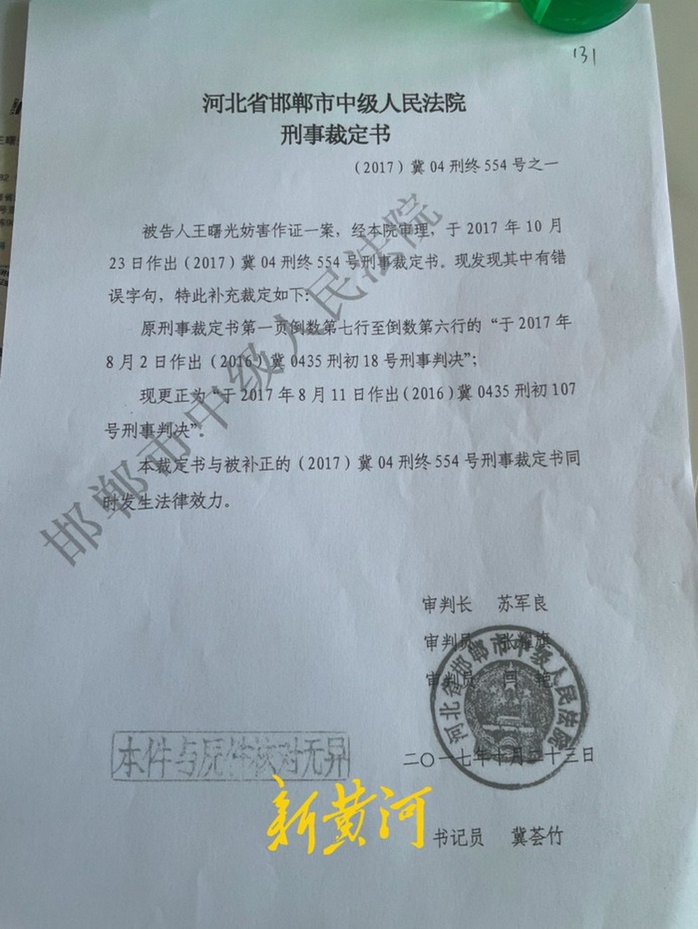 今年3月17日,河北高院出具补正通知书,并将原件邮寄给王曙光。4月19日,王曙光将自己的案情反映至中央巡视组,在中央巡视组督办下,邯郸中院仅向王曙光邮寄了补正文书复印件,至今仍未提供原件。