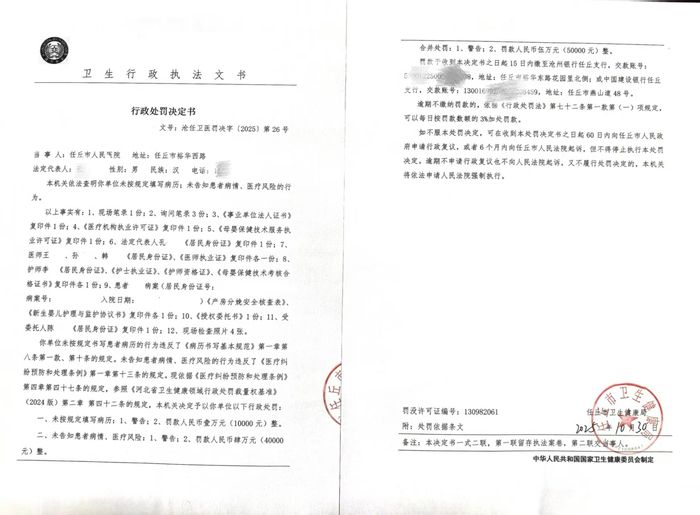 李霞提供的一份由任丘市卫健局出具的告知书内容显示,在李霞住院期间,经该局调解,任丘市人民医院主动提出为李霞垫付2万元医药费,遭到家属拒绝。针对这一说法,李霞称她和家属均不知情。出院后,李霞通过12345、国家信访平台等多渠道投诉后,2025年任丘市卫健局以未按规定书写患者病历、未告知患者病情、医疗风险等为由对任丘市人民医院作出罚款5万元的行政处罚。