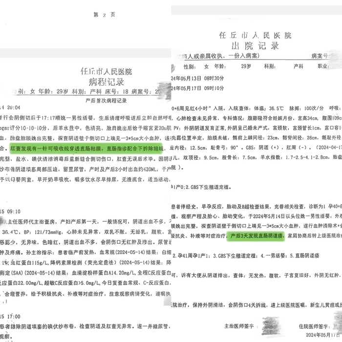 李霞提供的任丘市人民医院病程记录显示,2025年5月14日顺产分娩手术过程中,“肛查发现有一针可吸收线穿透直肠黏膜,直肠指诊配合下拆除缝线,医生探查直肠黏膜完整,盐水、碘伏清洁消毒后重新缝合侧切伤口,肛查无误后术毕。”“这份病程记录证实术中已发生直肠损伤,但我是在出院时才拿到这份记录,而医生全程未告知我们,也没有采取相关治疗措施。”另一份医院出院记录载明,“产后3天发现直肠阴道瘘,家属协商后转上级医院治疗”,也印证该损伤系分娩手术操作所致。