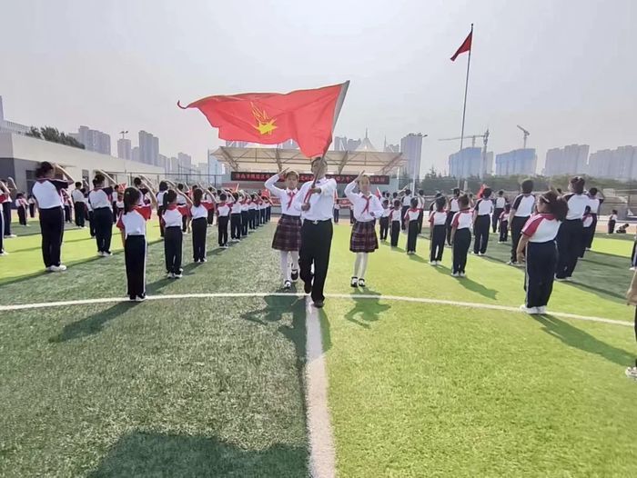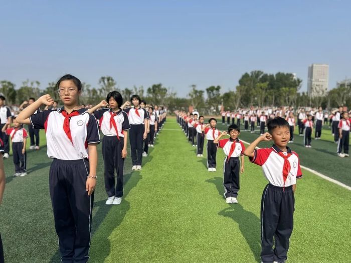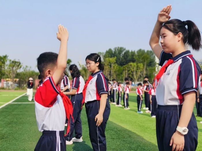 仪式在激昂的出旗曲中拉开帷幕,少先队旗手高举队旗,步伐铿锵。全体队员齐唱《中国少年先锋队队歌》,嘹亮的歌声传递出新时代少先队员的坚定信念。随后,大队委宣读组建少先队组织的决定及新队员名单,老队员为新队员佩戴红领巾,并互敬队礼,完成少先队精神的传承。