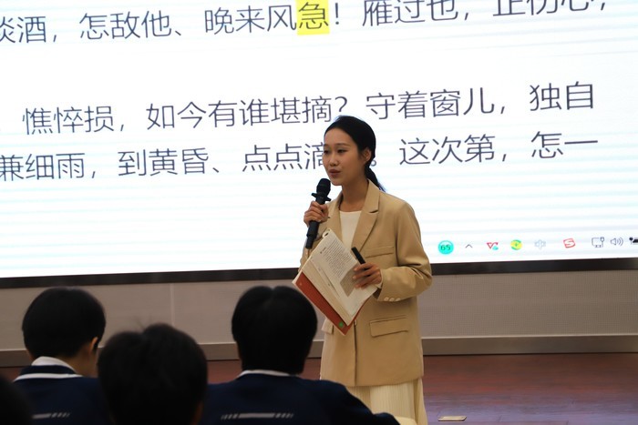 活动伊始,历城二中两位青年教师分别进行了精彩纷呈的课堂展示,他们以扎实的教学功底,带领学生一起进行了语文课程的学习。教师展茂寒首先展示了《声声慢》一课,她以李清照的《如梦令》结合大明湖视频导入,“这方邻水的溪亭或许见证过她年轻时的欢乐时光,这满池的藕花也见证了她鲜活的生命。但当我们读《声声慢》时感觉还是这样灵动鲜活吗?”带着问题,品读文章,细品词句,感受愁绪,最后通过两篇文章的对比联读,加深理解。