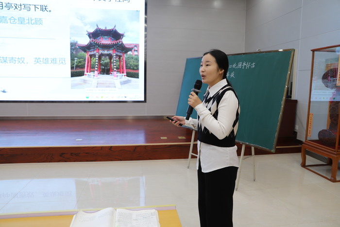 教师杜一涵讲授的是《永遇乐·京口北固亭怀古》,她与同学们一起分三个步骤对课文进行梳理和学习,初读文章,整体感知;聚焦用典,分析深意;学以致用,拟写对联。步步深入,层层递进,通过怀古抒发对时局的忧虑,融合历史典故与现实政治,感受作者对国家命运的深切关怀。