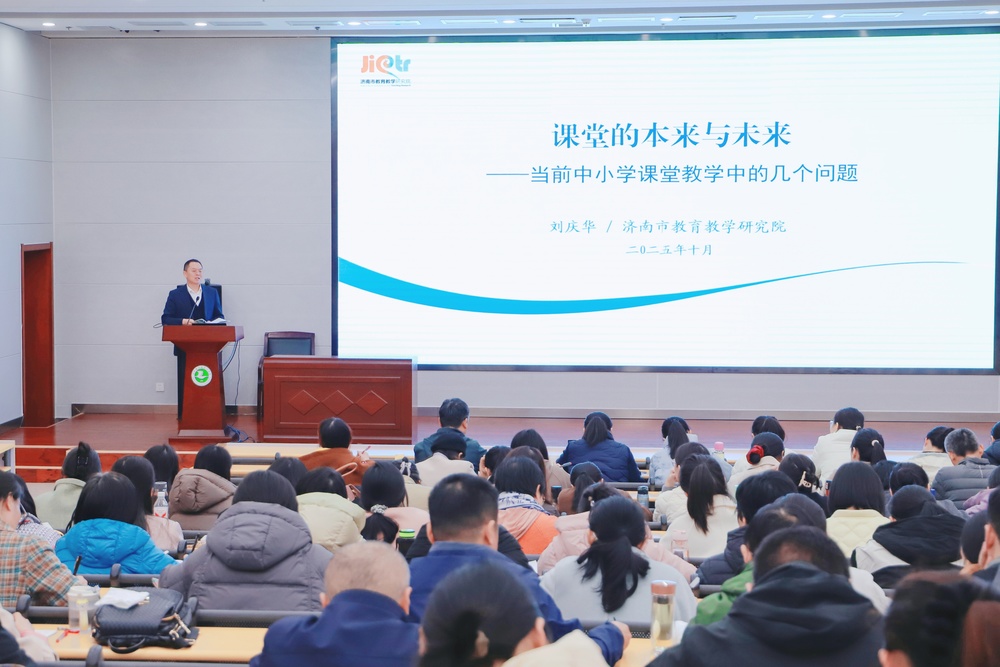 研讨会最后,济南市教育教学研究院党委书记、院长刘庆华以《课堂的本来与未来——当前中小学课堂教学中的几个问题》为题作专题报告。他指出,课堂是学校教育活动的核心场所,是师生共同参与教学的互动过程,以学习为中心的课堂,需要从“教师教学视角”走向“学习者学习的视角”,即从教学质量转向学习指标。他就当前课堂存在的教学规律把握不足、新课标存在误读等问题进行了深入解读,并以鲜活的案例,就如何上好一堂课进行了深入浅出的讲解。并表示,老师要把课上得干净而有分量,不掺杂非教学杂质,还得有“营养”,未来的课堂教学必定要满足基于课标、推进知识结构化、强化实践、落实教学一致性四个维度。