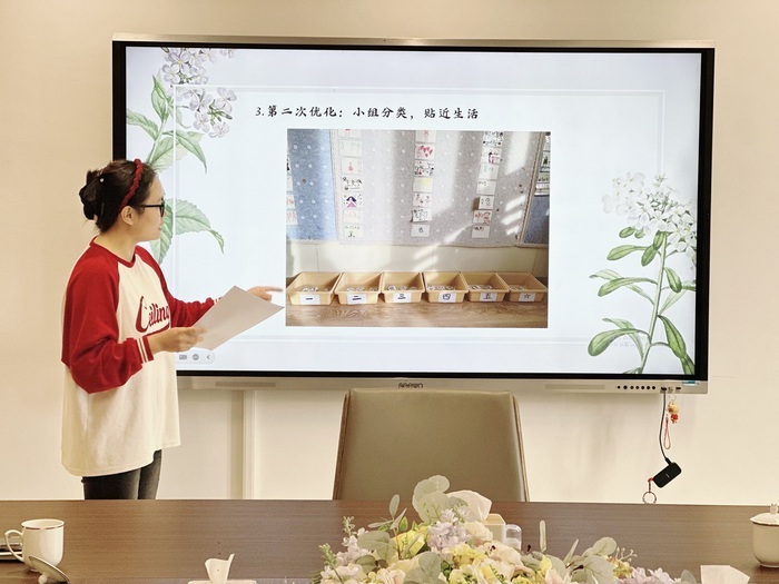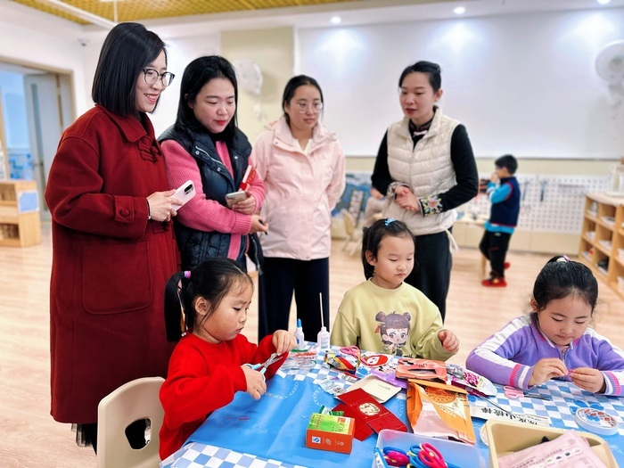 在观摩环节,幼儿园教师向崇实小学的教师们详细介绍了班级各区域的活动材料与教育设计。从建构区的创意拼搭字宝宝,到美工区的汉字主题作品;从图书区的“汉字零食”小报,到益智区的趣味数字游戏——每个区域都充分体现“以幼儿为本”的教育理念,让孩子们在游戏中动手操作、在生活中自然学习,潜移默化中积累知识与经验。