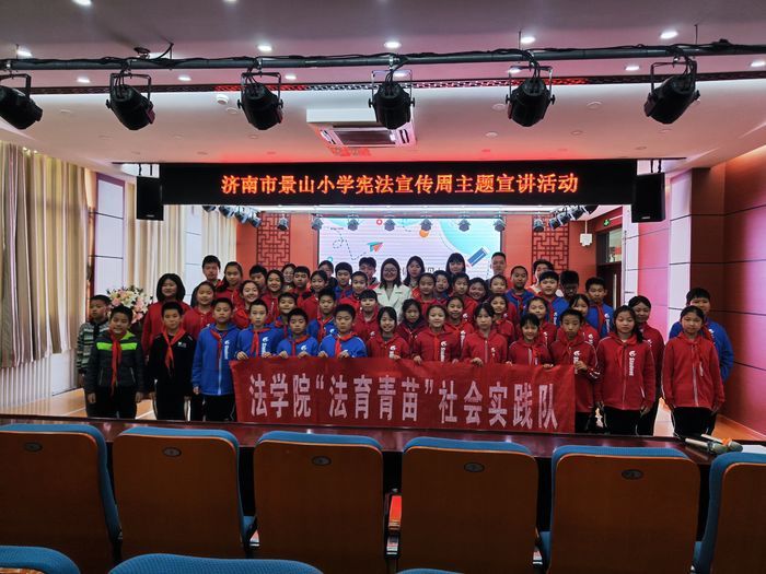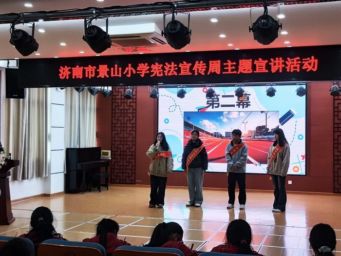 宪法宣传周期间,济南市景山小学邀请山东政法学院法治宣讲团进校园,以“拒绝欺凌,法治同行”为主题,通过情景剧演绎、互动问答等趣味形式,让抽象宪法知识“活”起来,为少先队员筑牢校园安全防护网。