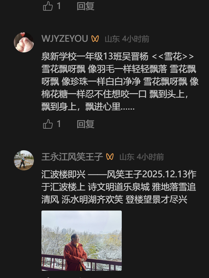在这场自发的诗词盛宴中,一位化名“王永江风笑王子”的济南市作家协会会员也加入其中。这位出版过18本诗集的诗歌爱好者,在汇波楼上即兴创作《汇波楼即兴》:“诗文明道乐泉城,雅地落雪追清风。泺水明湖齐欢笑,登楼望景才尽兴”,为这场冬日雅事增添了别样的风景。