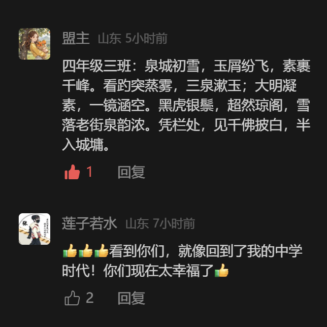 泉新学校三年级十六班学生赋词一阕:“泉城初雪,玉屑纷飞,素裹千峰。看趵突蒸雾,三泉漱玉;大明凝素,一镜涵空。黑虎银鬃,超然琼阁,雪落老街泉韵浓……”笔触间尽显泉雪相映的古城风韵。