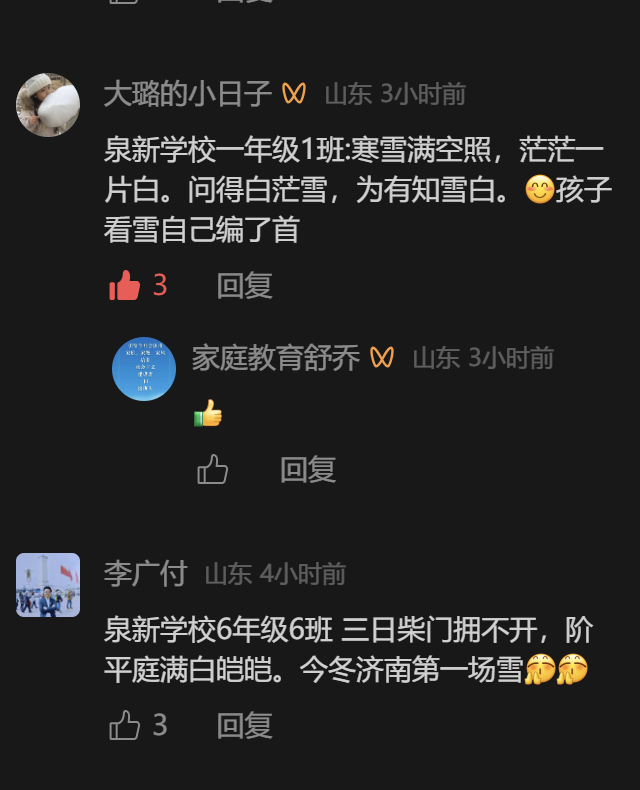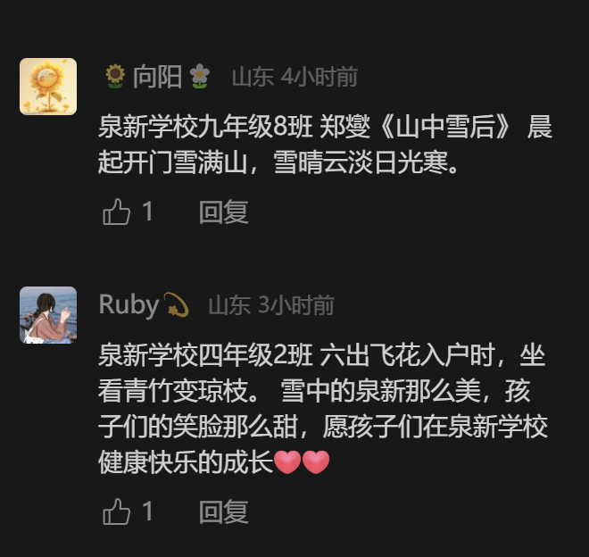 家长们也欣然留言。泉新学校一年级学生家长分享孩子自创的童诗:“寒雪满空照,茫茫一片白。问得白茫雪,为有知雪白。”四年级家长引用唐诗人高骈《对雪》名句留言寄语:“六出飞花入户时,坐看青竹变琼枝。雪中的泉新那么美,孩子们的笑脸那么甜。”