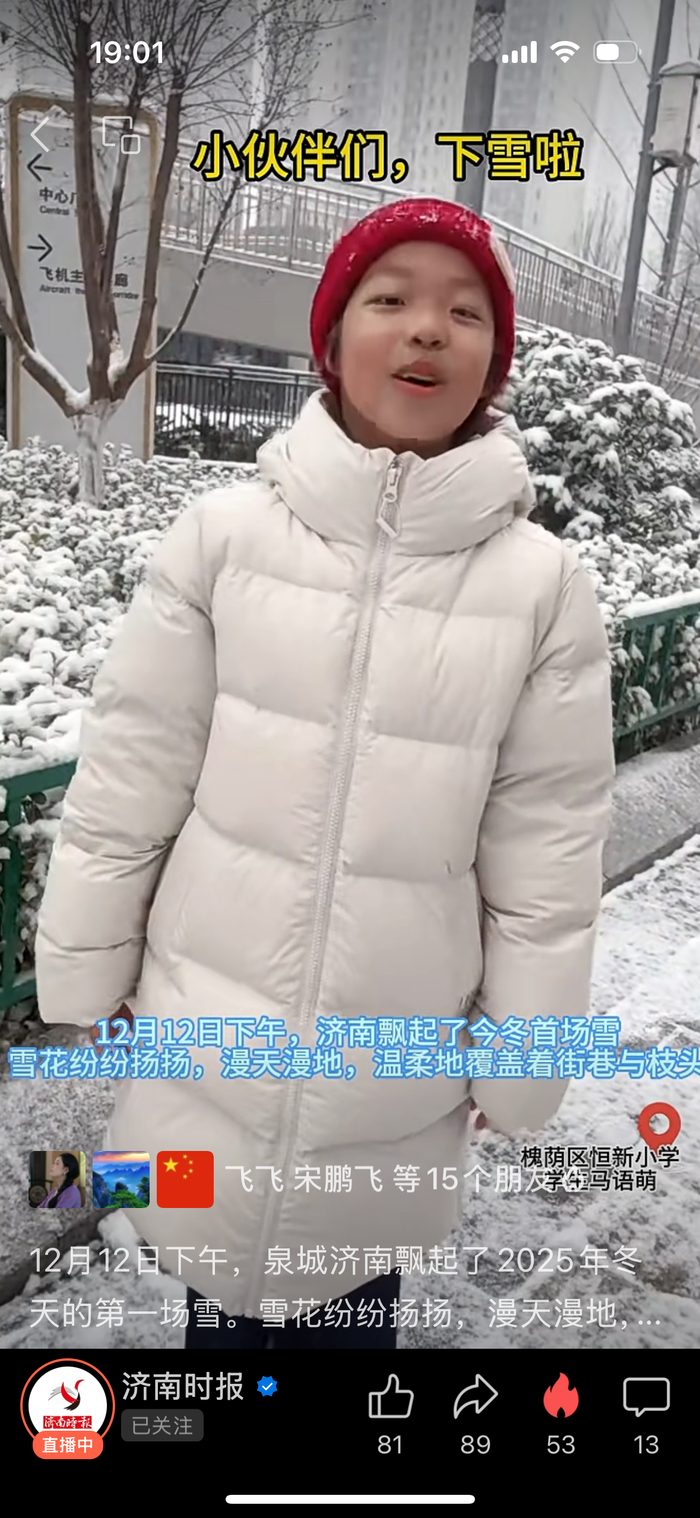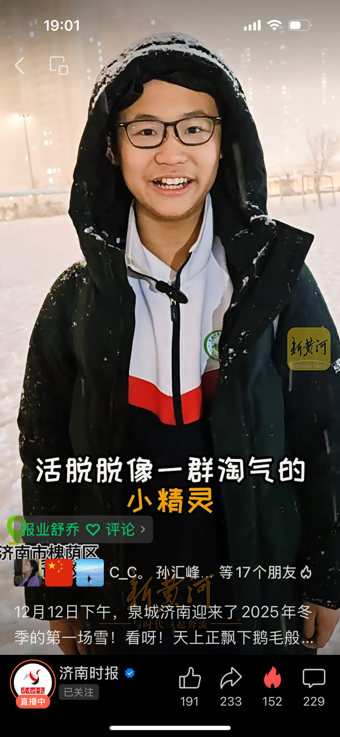 2025年12月12日下午,泉城济南迎来今冬第一场雪。这场翩然而至的初雪,不仅装点了大街小巷,更在网络上点燃了一场以诗词赞美家乡初雪的热潮。槐荫区两位小学生的短视频,引发泉城学子与家长纷纷以古诗词或自创诗句,抒发对雪中济南的热爱。