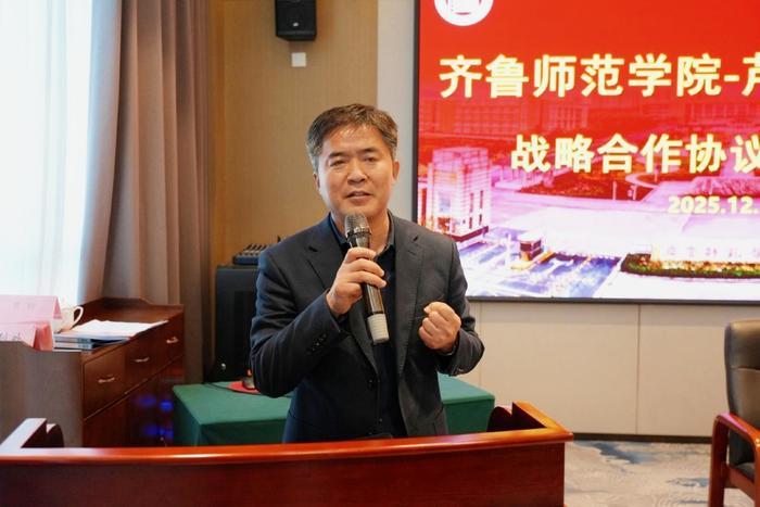 随后,齐鲁师范学院党委委员、副校长孙洪兆介绍了学校办学情况,齐鲁师范学院建校70余年来,深耕服务基础教育创新发展,在人才培养、科研创新社会服务等方面成果丰硕。此次合作是响应教育强国战略、服务区域发展的具体行动,学校将严格按照合作框架协议要求,在基地建设、课程实施、研学组织、安全保障等环节压实责任、细化举措,确保合作项目“早落地、早见效”,实现优势互补、协同创新、合作共赢。