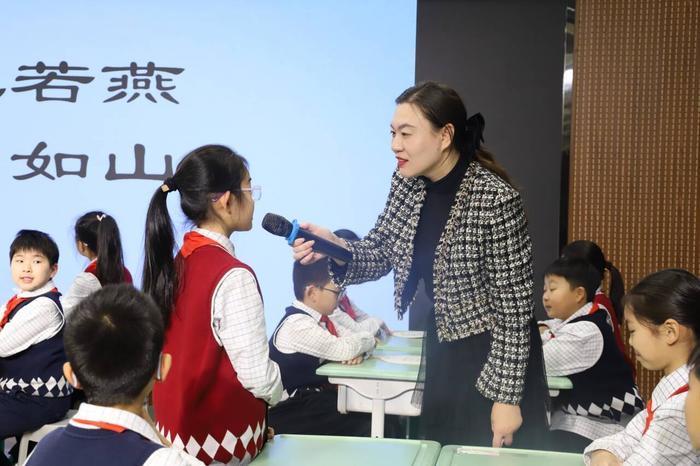 在接下来的教学展示环节,燕山小学王敏主任与“和燕诗社”的同学们带来了一堂生动的楹联课。学生们运用所学技巧,现场为嘉宾创作嵌名联,展示了扎实的学习成果。这次课程也展现了未来双方在楹联教学方面合作的可能方向。