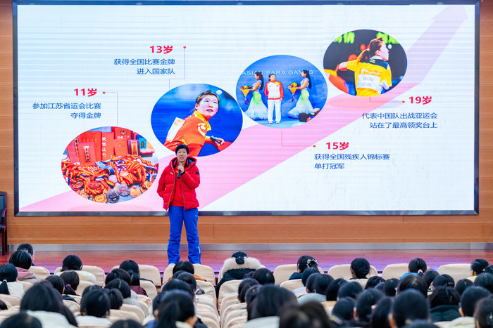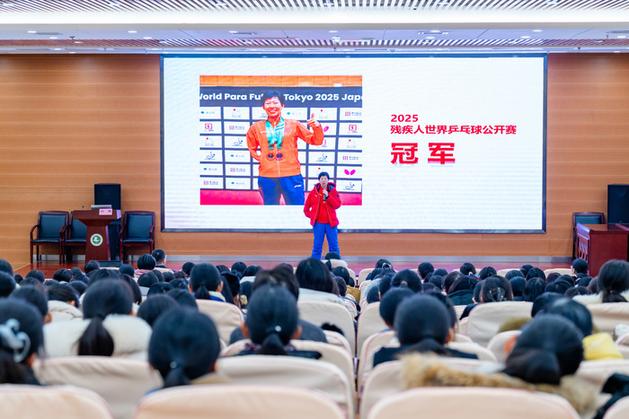 第116个“三八”国际妇女节来临之际,2025年残疾人乒乓球世界公开赛冠军、山东省三八红旗手刘旭应邀走进济南历城二中为全校500余名女职工带来了一场别开生面的专场报告会。