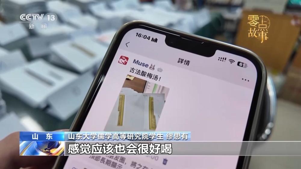 山东大学儒学高等研究院学生 缪思有:当时录到那本书,里面就是录了一个酸梅汤的做法,就觉得很有趣,然后还发朋友圈说简直是古法酸梅汤,感觉应该也会很好喝。