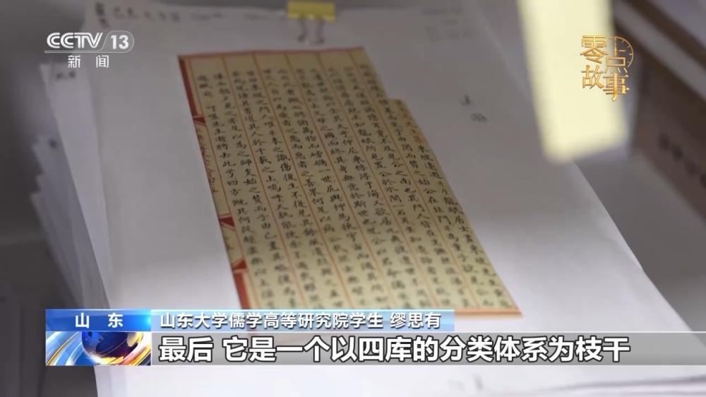 山东大学儒学高等研究院学生 缪思有:一个夹子就是一本书。把这些书汇集到一起后,再按照经、史、子、集四部分类的方式进行排序。最终,以四库的分类体系为枝干,将《永乐大典》等书的内容作为叶子填充进去,呈现出一种分书重编的形态。