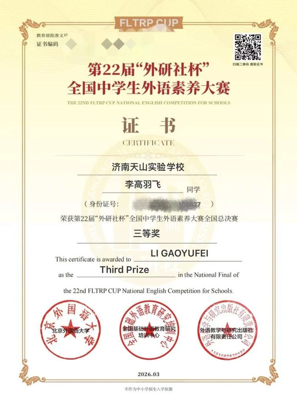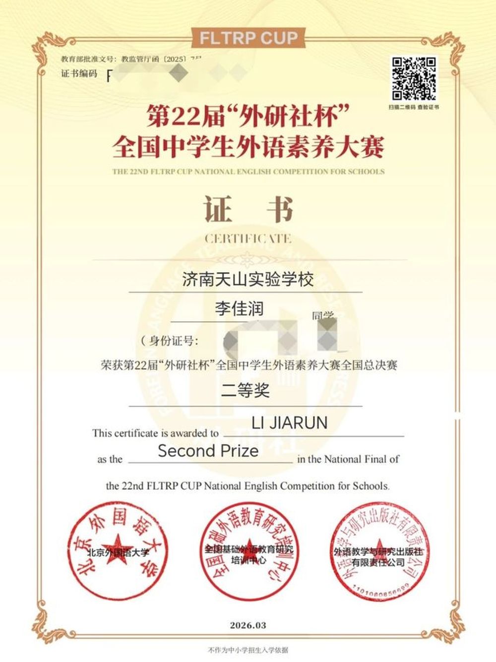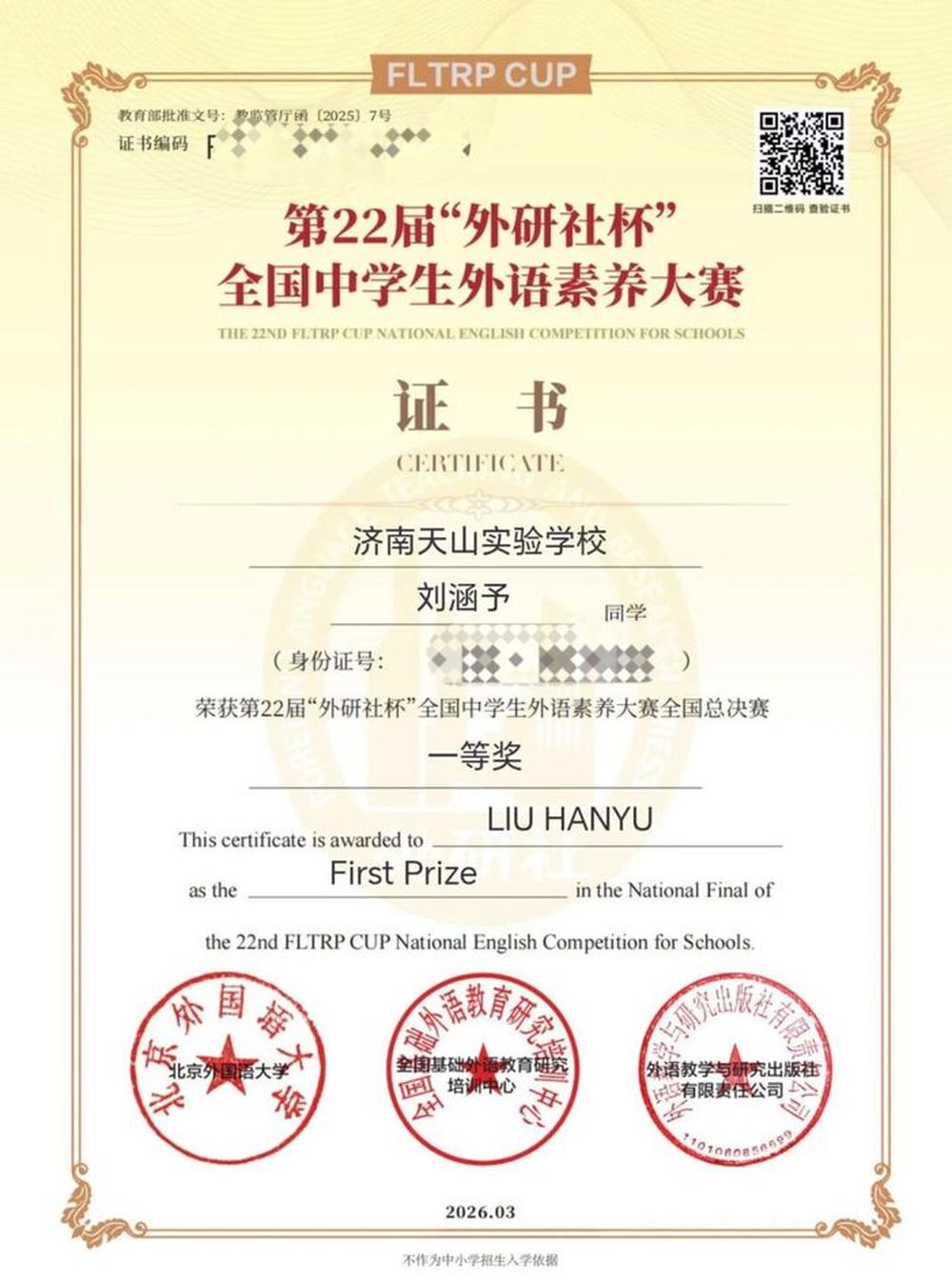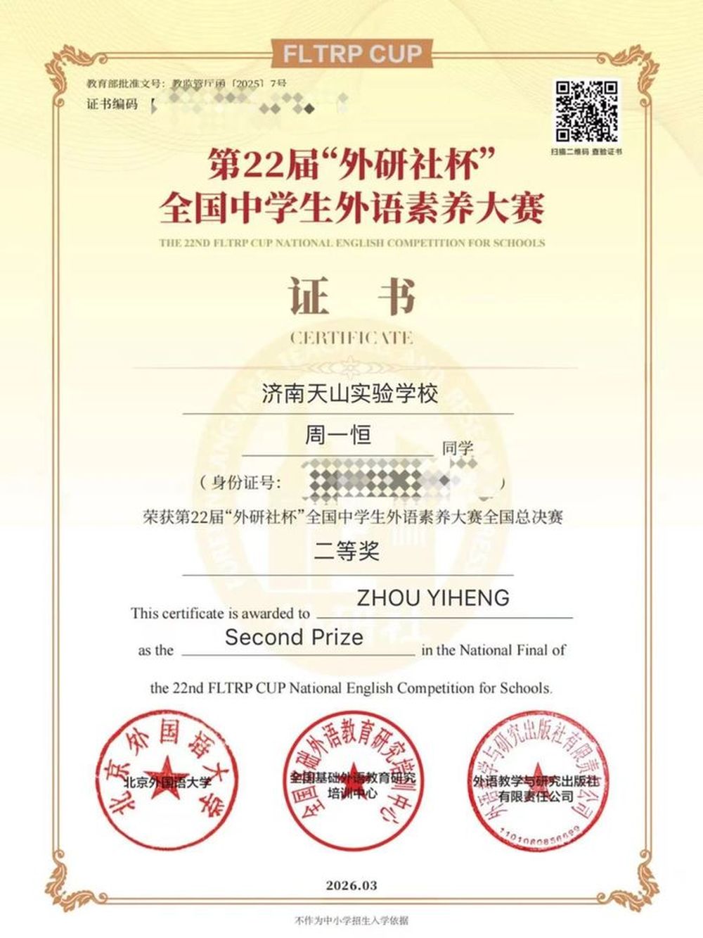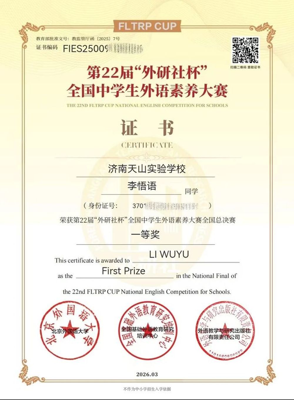 第22届“外研社杯”全国中学生外语素养大赛全国总决赛获奖名单日前揭晓,济南天山实验学校学子在本次大赛中表现优异,其中刘涵予、李悟语两位同学获国赛一等奖,周一恒、李佳润两位同学获国赛二等奖;李高羽飞、高子涵两位同学获国赛三等奖,另有76位同学分获省级一二三等奖。