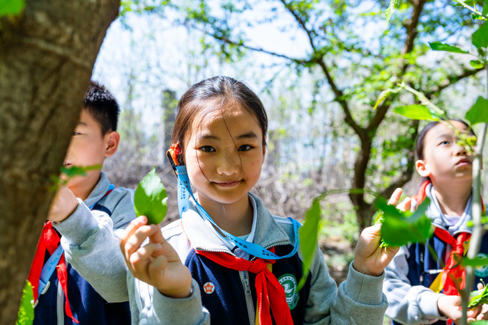 随后,同学们来到四季豆友农场,化身“小小农耕传承人”,学习炒制桑茶。首先,大家在桑树林,学习正确的采桑叶手法。挑选大叶片,轻捏叶柄、小心翼翼取下……明媚春光中,同学们穿梭于一棵棵桑树之间,不一会儿,头上就已经沁出汗水。