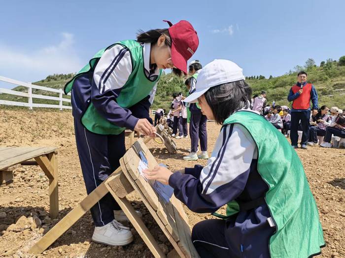 在农场里,同学们拿起铁锹,变身“小农夫”,在农技老师的指导下,分组协作,划线、刨坑、播种、覆土,一系列动作有条不紊。指尖沾染泥土,额头渗出汗珠,同学们认真对待每一粒高粱种子,小心翼翼地将其播撒在田间,也将热爱劳动、珍惜粮食的种子埋进了心里。