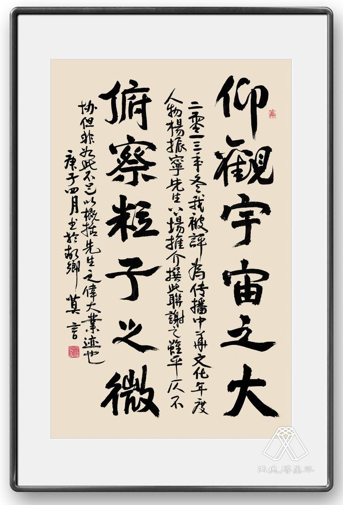 莫言还提到,2013年冬天,他被评为传播中华文化年度人物,杨振宁先生上场推介。莫言撰联感谢:仰观宇宙之大 俯察粒子之微。莫言解释:“虽平仄不协,但非如此不足以概括先生之伟大业绩也!”