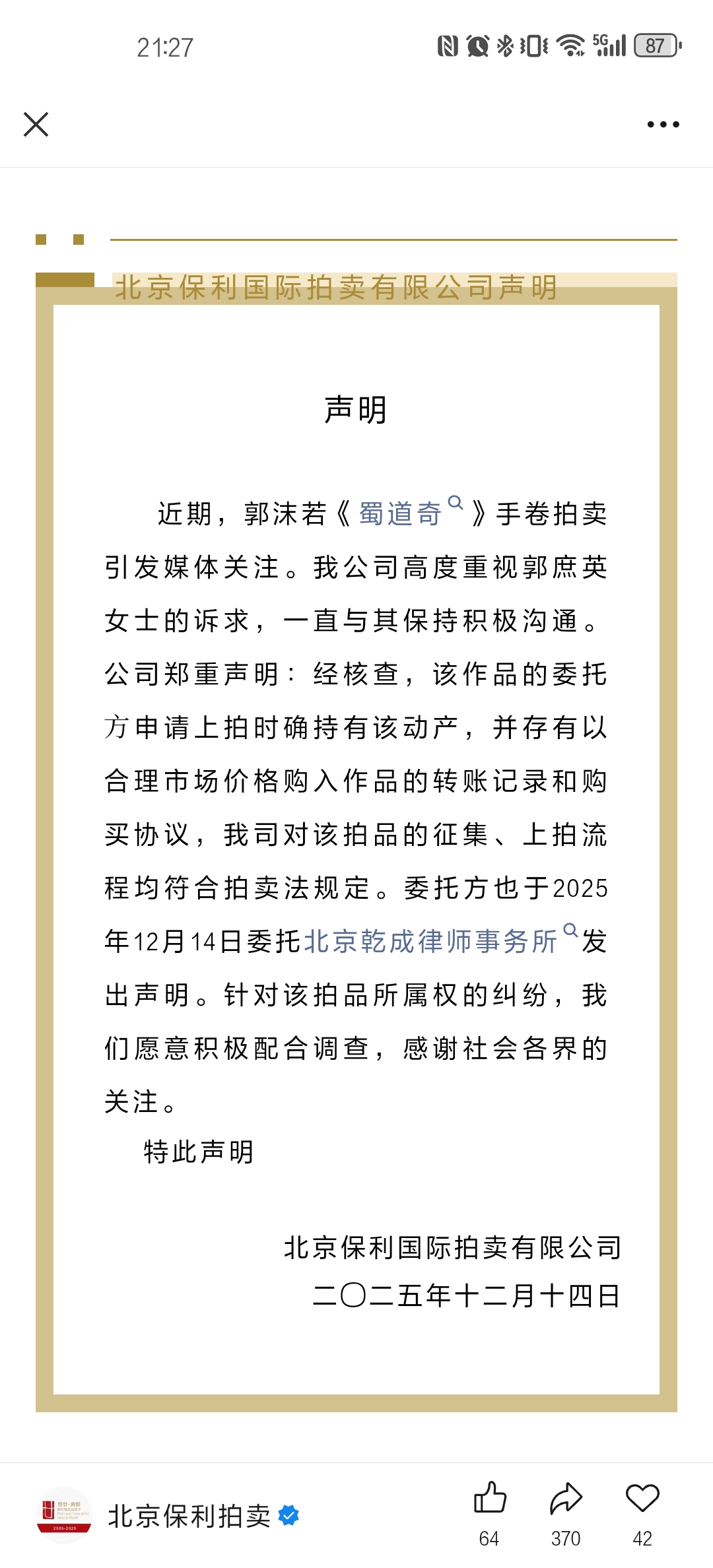 12月14日晚,北京保利国际拍卖有限公司就此事做出声明。北京保利拍卖表示,经核查该作品的委托方申请上拍时确持有该动产,并存有以合理市场价格购入作品的转账记录和购买协议,公司对该拍品的征集、上拍流程均符合拍卖法规定。委托方也于2025年12月14日委托北京乾成律师事务所发出声明。针对该拍品所属权的纠纷,北京保利拍卖愿意配合调查。
