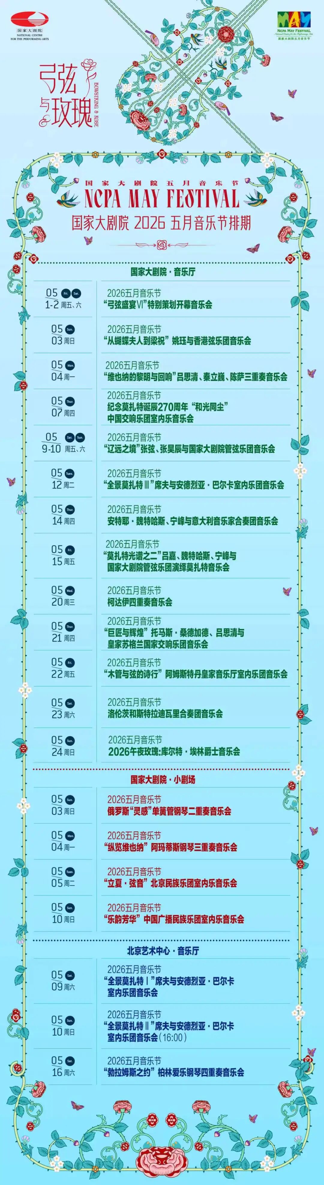 2026年适逢“音乐天才”莫扎特诞辰270周年,本届五月音乐节以莫扎特作品贯穿始终,用室内乐的细腻形式回溯古典主义黄金时代的纯粹与优雅。本届音乐节阵容堪称星光熠熠,吕思清、秦立巍、陈萨、宁峰、安特耶·魏特哈斯、安德拉斯·席夫、张昊辰、洛伦茨·纳斯图里卡-赫尔舒科维奇等中外独奏名家联袂登场,柏林爱乐钢琴四重奏、柯达伊四重奏、阿姆斯特丹皇家音乐厅室内乐团、意大利音乐家合奏团、香港弦乐团等国际顶级室内乐团体悉数亮相,国家大剧院管弦乐团深度参与多场重磅演出,弦乐、管乐、钢琴、交响室内乐多元呈现,全方位展现室内乐的协作之美与艺术魅力。