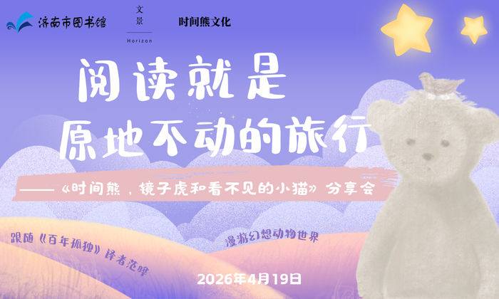 如果现实太忙碌,不如躲进幻想里喘口气。如果无法远行,那就翻开书,来一场原地不动的旅行。4月19日(星期日)14:00,济南市图书馆特邀《百年孤独》译者、北京大学副教授范晔,携其首部原创幻想文学作品《时间熊,镜子虎和看不见的小猫》,与大家分享这场特殊的“旅行”。