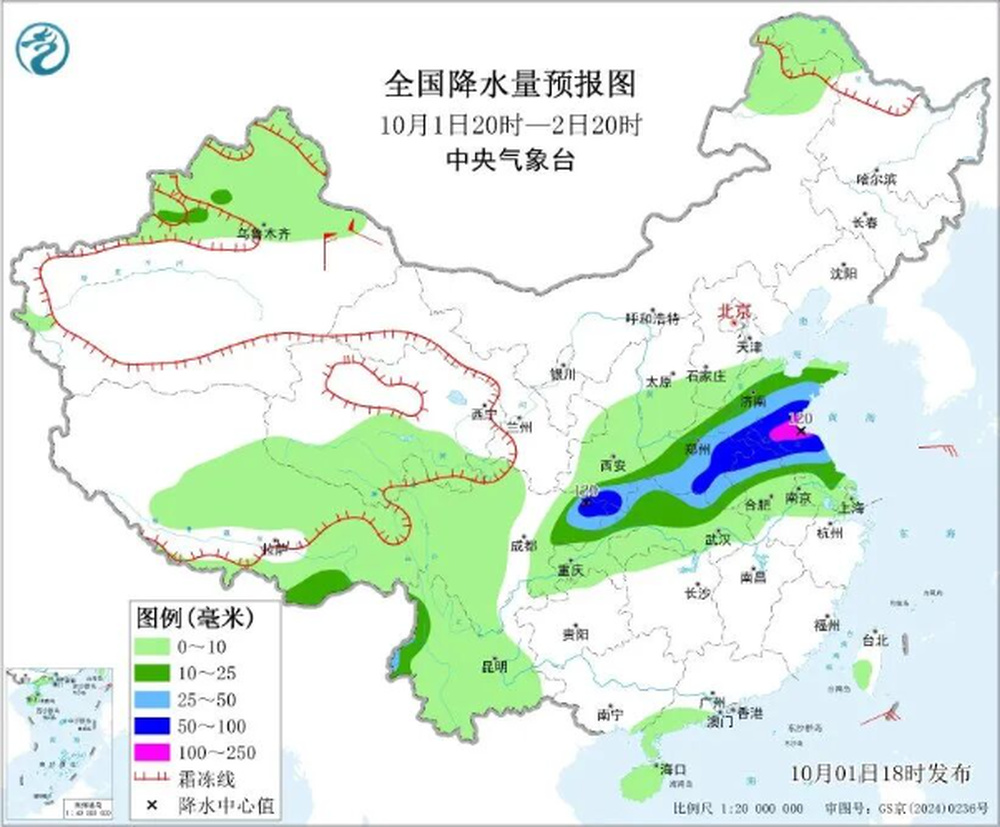 ●中央气象台预计,10月1日20时至2日20时,西北地区东南部、黄淮大部、江淮东部和西部、江汉北部、西南地区东北部等地部分地区有中到大雨,其中,陕西南部、山东南部、河南东部和南部、安徽北部、江苏北部、四川盆地东北部等地部分地区有暴雨或大暴雨。