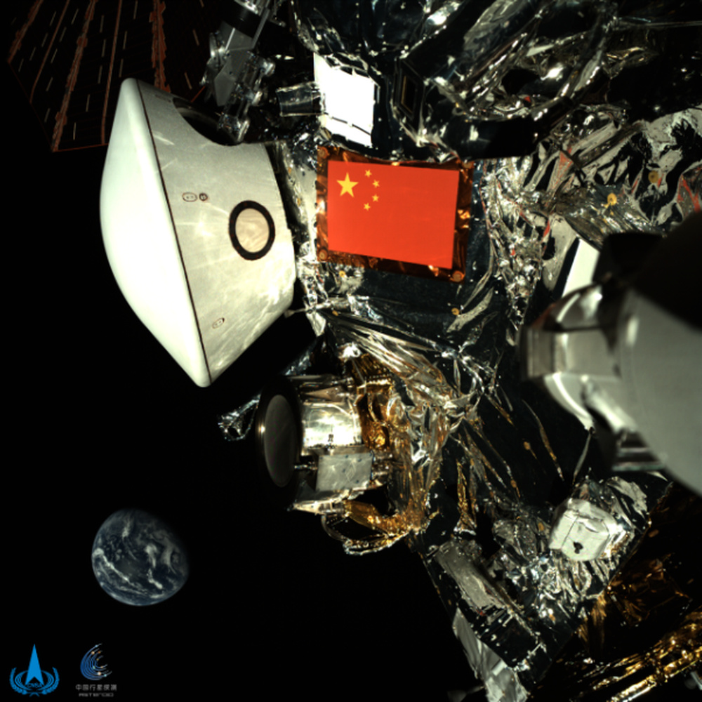 ●10月1日,国家航天局发布了行星探测工程天问二号任务探测器在轨飞行期间获取的探测器与地球合影图像,探测器上的五星红旗与地球同框。
