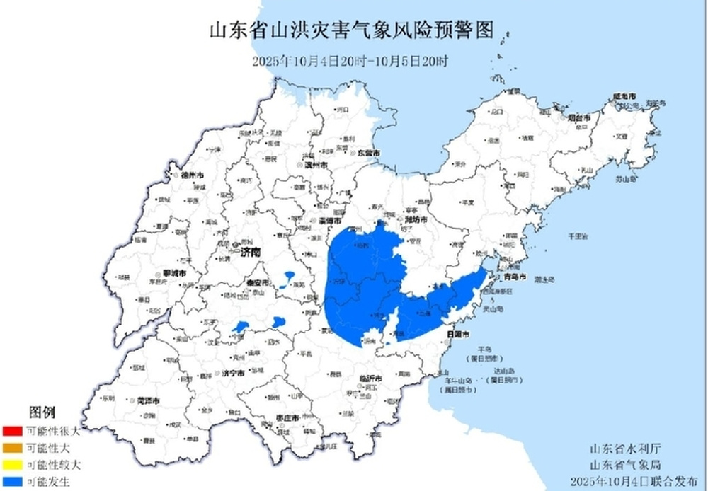 山东省水利厅和山东省气象局10月4日联合发布山东省山洪灾害气象预警:预计10月4日20时至10月5日20时,济南、青岛、淄博、潍坊、泰安、日照、临沂等市局部地区可能发生山洪灾害(蓝色预警)。