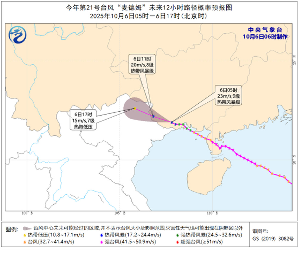 ●今年第21号台风“麦德姆”的中心于5日下午在广东省湛江市徐闻县东部沿海登陆,登陆时中心附近最大风力有14级。6日凌晨在广西壮族自治区防城港市沿海再次登陆,登陆时中心附近最大风力有10级,登陆后强度继续减弱。