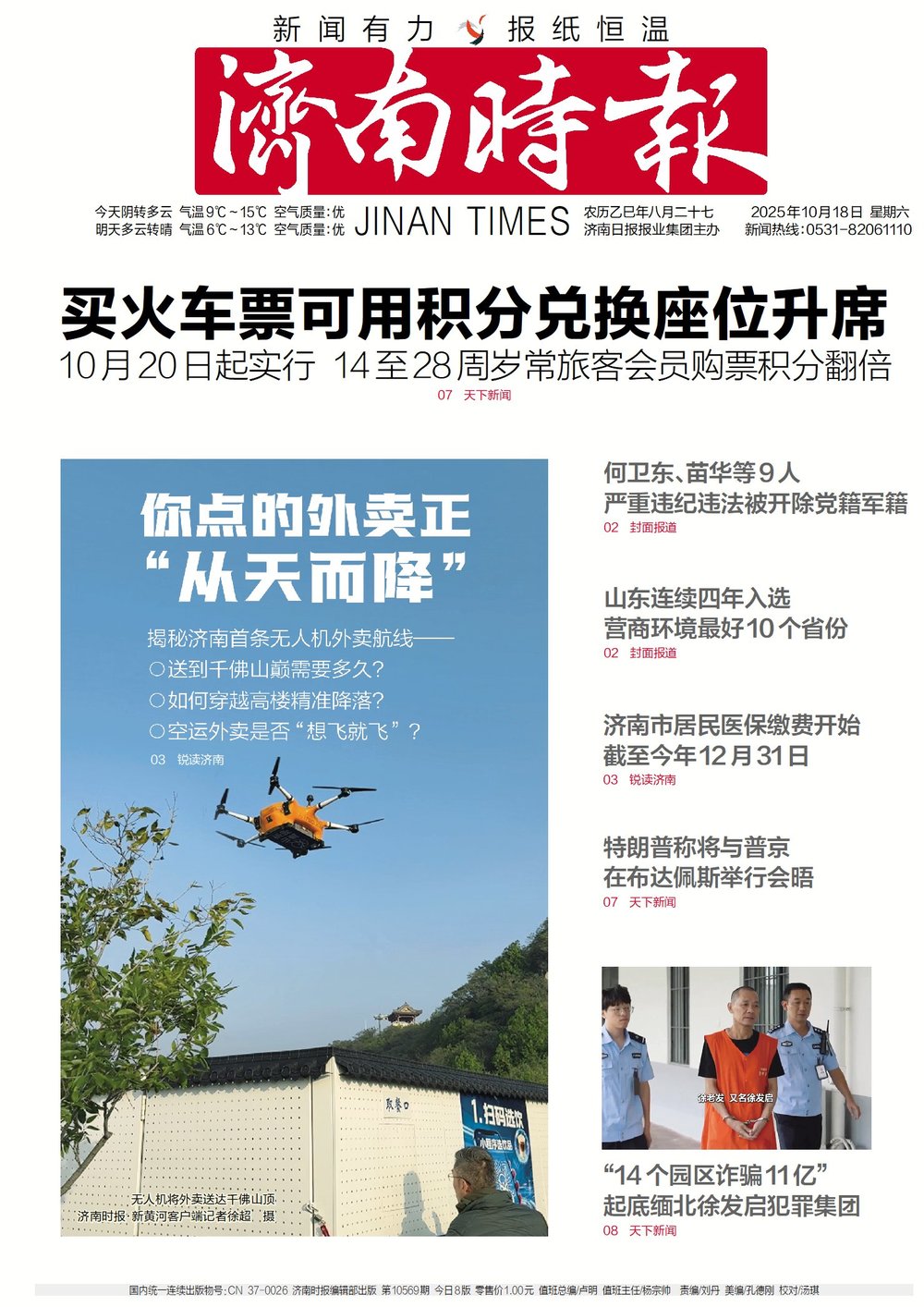 工作人员从机腹取出空运箱,四杯鲜果茶饮递到游客手中。这标志着济南首条景区无人机外卖航线投入常态化运营。