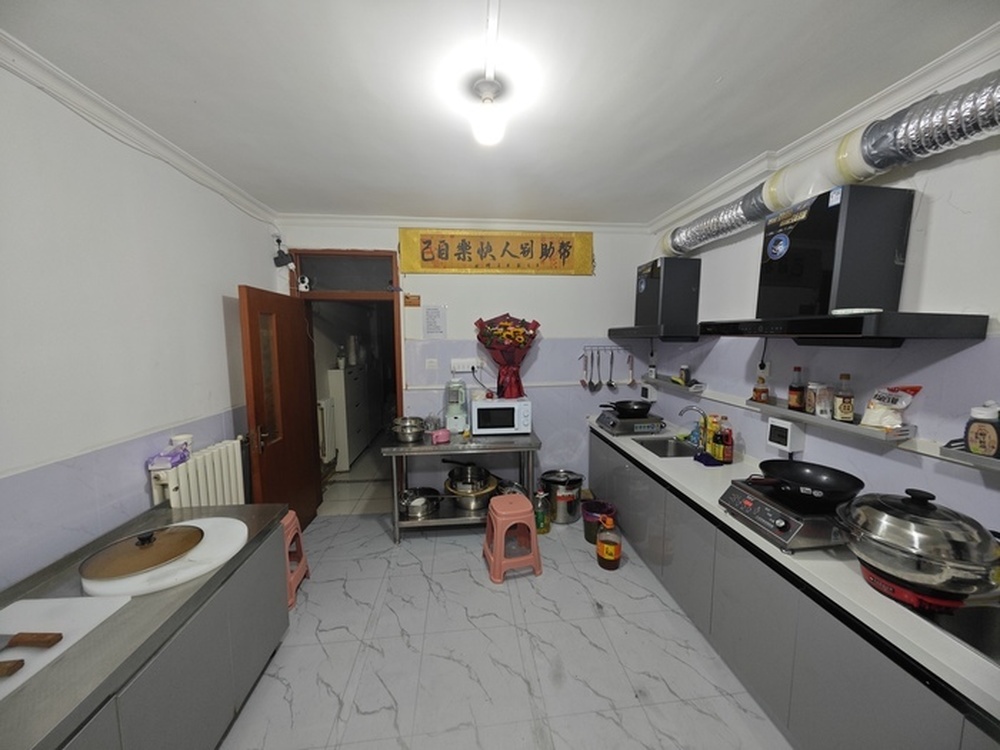 厨房里,两个电磁炉和一个电热锅正冒着热气,墙上“帮助别人快乐自己”的大字在灯光下格外醒目。一位中年男子细心检查着厨房的每个角落,他是这间爱心厨房的创始人郑刚。