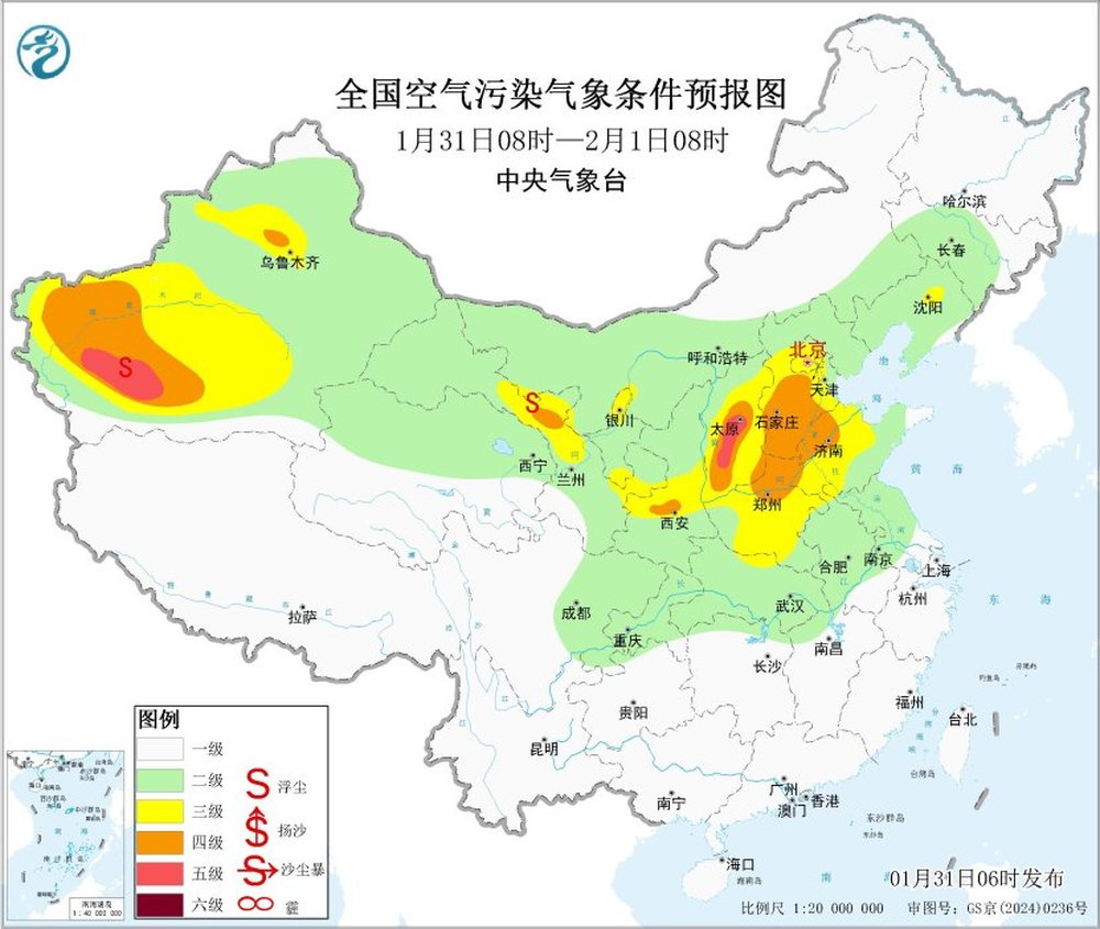 ●1月31日至2月1日,华北中南部、黄淮中西部、汾渭平原、新疆天山北坡等地大气扩散条件一般,上述地区有轻至中度霾,局地重度霾。2月2日起,受弱冷空气影响,华北中部、黄淮中部的霾天气减弱或消散,但华北南部、黄淮西部等地霾天气继续维持,部分地区将有轻至中度霾,局地重度霾。5日起,受冷空气影响,上述地区霾天气自北向南逐渐减弱消散。