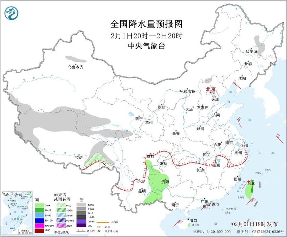 ●2月1日20时至2日20时,西藏西部北部和东部、青海南部、黑龙江中部等地部分地区有小雪或雨夹雪,其中,西藏西南部局地有中雪。云南东南部、广西西部、贵州西部、台湾岛等地部分地区有小雨,其中,台湾岛北部和东部等地部分地区有中雨。台湾海峡、南海北部海域将有5~7级、阵风8级的东北风,黄海中部海域将有4~6级、阵风7级的偏西转偏北风。