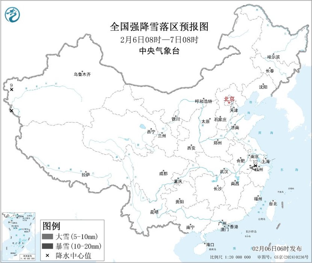 ●中央气象台2月6日6时继续发布暴雪蓝色预警:预计2月6日8时至2月7日8时,安徽南部、浙江北部等地部分地区有大雪,其中,浙江西北部等地部分地区有暴雪(10~12毫米)。上述部分地区新增积雪深度3~5厘米,局地可达8厘米以上。