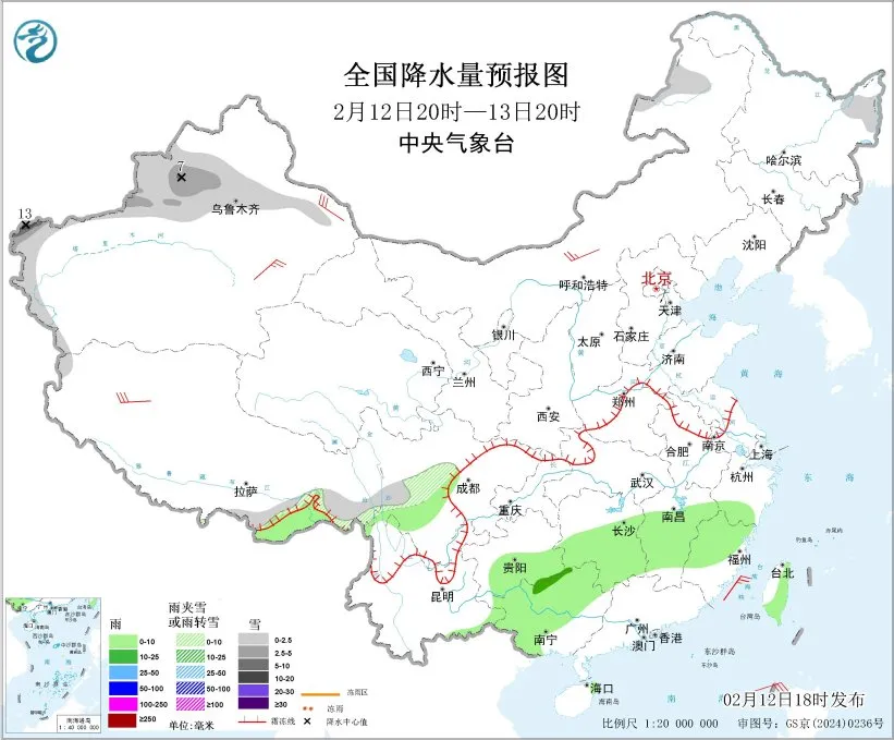 ●中央气象台预计,12日20时至13日20时,新疆沿天山地区和南疆西部山区、西藏东南部、川西高原南部等地部分地区有小雪或雨夹雪,其中,新疆沿天山地区西段和南疆西部山区等地有中到大雪,局地暴雪。