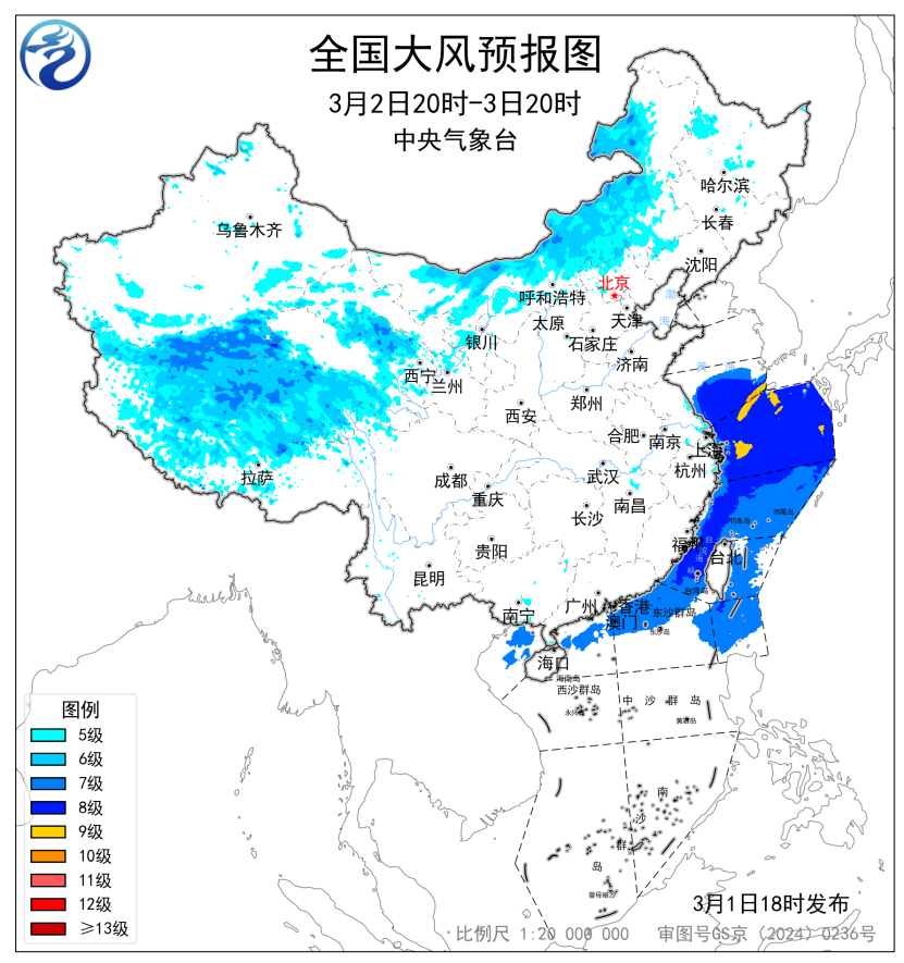 3月2日20时至3日20时,西藏中西部、青海南部和西部、甘肃河西、内蒙古中东部等地将有5~6级、阵风7~8级的大风;黄海南部海域、东海大部海域、台湾海峡、台湾以东洋面、巴士海峡、南海北部海域将有7~8级、阵风9级的大风,其中黄海东南部海域、东海西北部海域风力可达9~10级、阵风11级。