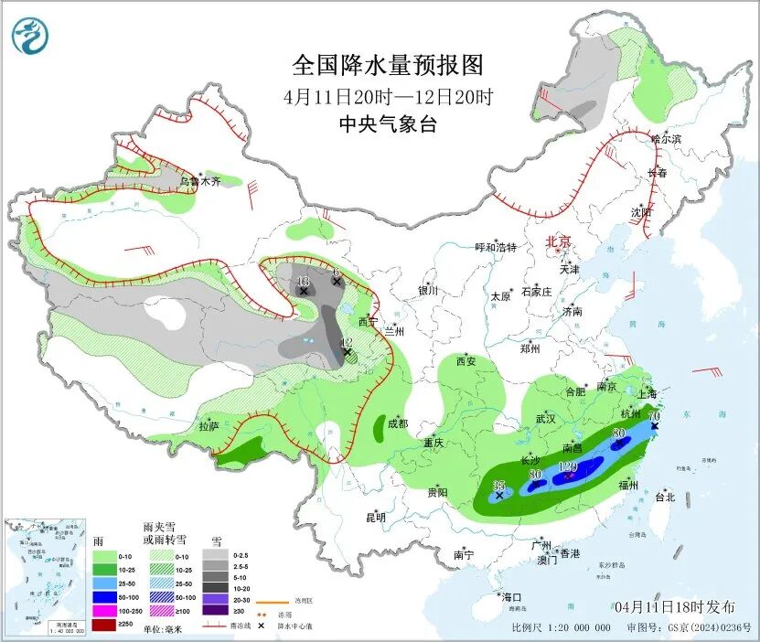 ● 中央气象台预计,11日20时至12日20时,西藏北部、青海南部和东部、甘肃西南部和祁连山山区、川西高原北部、内蒙古东北部、黑龙江西北部、新疆天山西段高海拔地区等地部分地区有小到中雪或雨夹雪;江南东部和南部、广西北部、广东北部、四川盆地西南部等地部分地区有中到大雨,其中,浙江南部、江西中南部、福建西北部、湖南东南部等地部分地区有暴雨或大暴雨。