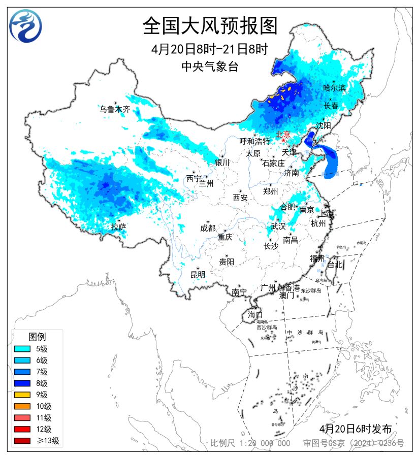 中央气象台4月20日6时继续发布大风黄色预警:预计,4月20日8时至21日8时,新疆沿天山地区和南疆盆地、西藏大部、青海大部、甘肃河西、内蒙古中东部、东北地区大部、河北北部、北京、天津、山东半岛、苏皖大部、湖北东部等地部分地区有5~7级风,阵风8~9级,其中新疆东部山口、西藏北部、内蒙古中部局地有8~9级风,阵风10级以上;渤海、渤海海峡、黄海北部海域、黄海中西部和西南部部分海域将有7~8级、阵风9级的大风。