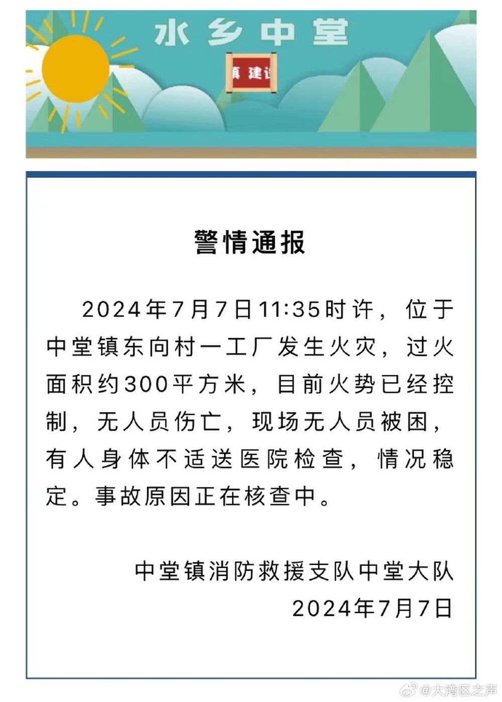 7日下午,中堂镇消防救援支队中堂大队通报:2024年7月7日11点35分,位于中堂镇东向村一工厂发生火灾,过火面积约300平方米,目前火势已经控制,无人员伤亡,现场无人员被困,有人身体不适送医院检查,情况稳定。事故原因正在核查中。
