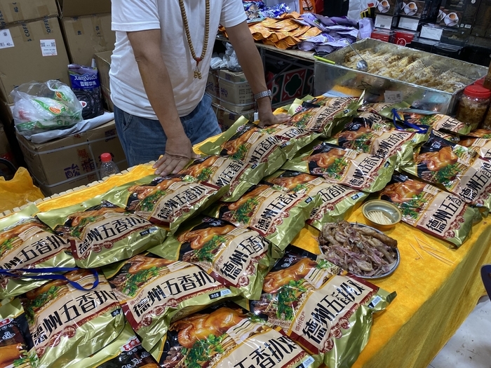 新黄河记者注意到,一处专门售卖“德州扒鸡”的展位围起了厚厚的人墙。游客们一边品尝着美食,一边竖起了大拇指。“太好吃了,买!多买些!”