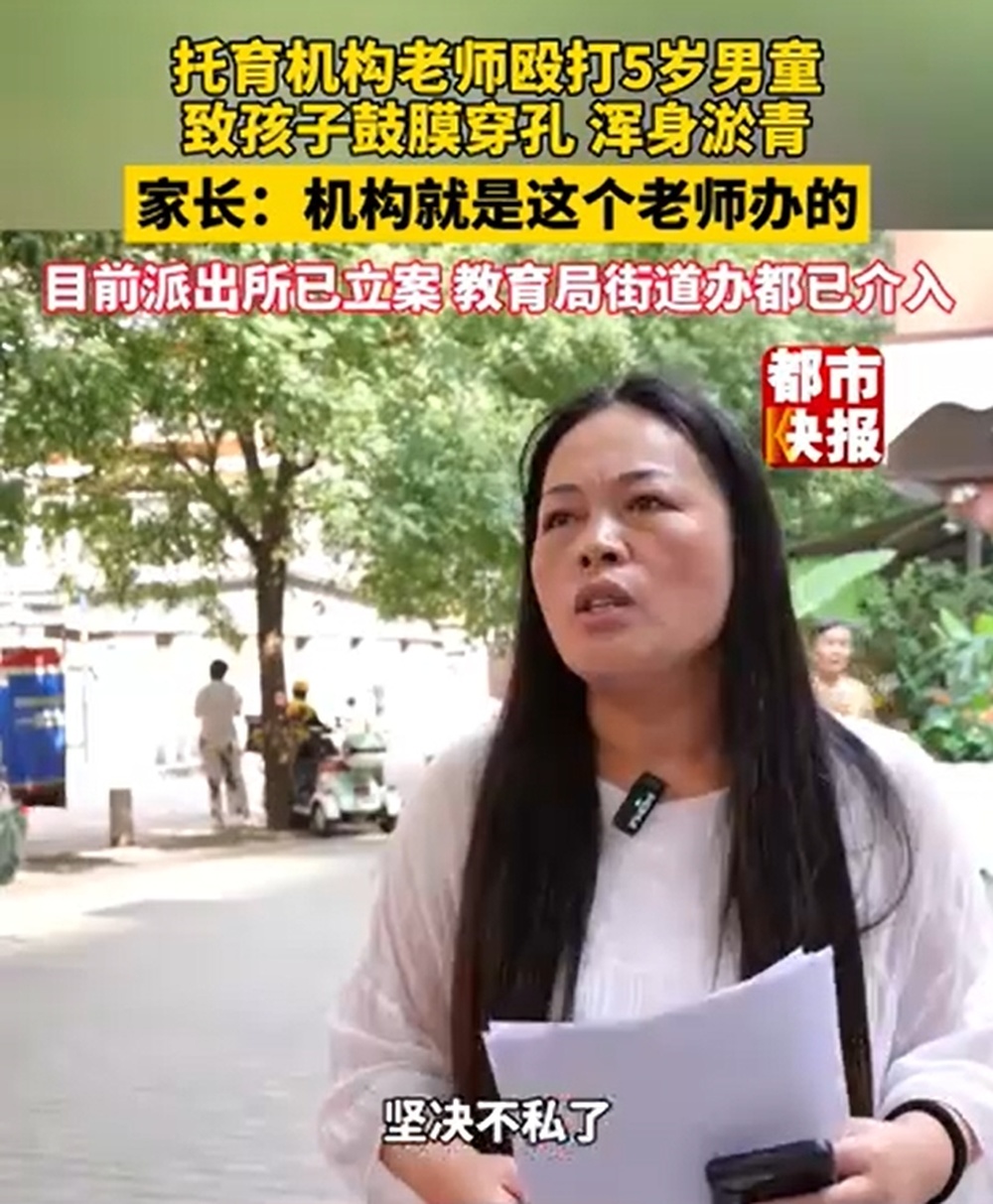 此前,据@陕西都市快报 8月22日报道,陕西一托育机构老师殴打5岁男童致鼓膜穿孔、浑身淤青。家长称,机构是这个老师办的。新城分局胡家庙派出所已立案,新城区教育局、胡家庙街道办都已介入。