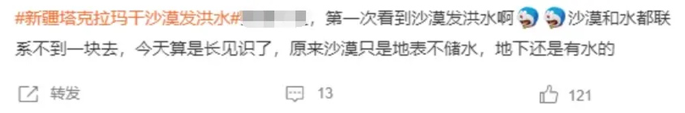 “当局部地区的降水强度超过了沙漠入渗的强度以后,洪水就产生了”,中国科学院新疆生态与地理研究所研究员周宏飞向记者介绍,沙漠的渗水速率较快,但蓄水能力差。