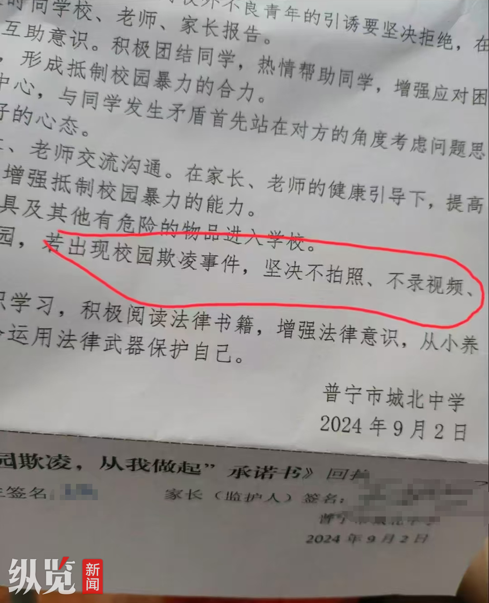 纵览新闻记者注意到,该网友发布的视频中,这张承诺书的落款为“普宁市城北中学”,时间为“2024年9月2日”,最下面有学生和家长的签字。有人在评论区说“意思是被霸凌了还不能保留证据吗”。纵览新闻记者私信该网友了解情况,截至发稿前未收到回复。