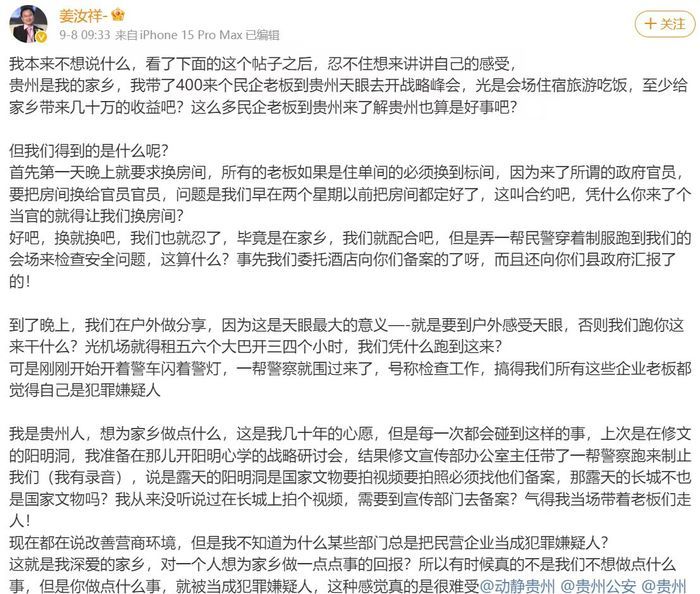 9月8日,锡恩集团董事长、“海归”十大创业人物姜汝祥在微博上发文称,他带了400名民营企业家前往贵州天眼景区开会,在事前已经向当地备案的情况下被要求把单间换给政府官员,且在户外分享之时被警方以检查工作的名义围住。姜汝祥在文中还称,贵州是自己家乡,想要为家乡做点事情,却被当成犯罪嫌疑人,这种感觉很难受。