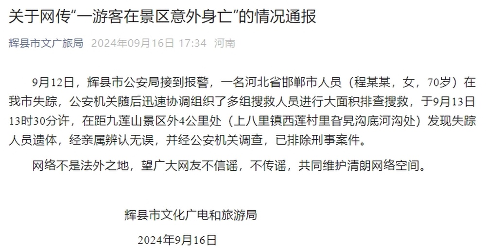 9月12日,辉县市公安局接到报警,一名河北省邯郸市人员(程某某,女,70岁)在我市失踪,公安机关随后迅速协调组织了多组搜救人员进行大面积排查搜救,于9月13日13时30分许,在距九莲山景区外4公里处(上八里镇西莲村里旮旯沟底河沟处)发现失踪人员遗体,经亲属辨认无误,并经公安机关调查,已排除刑事案件。